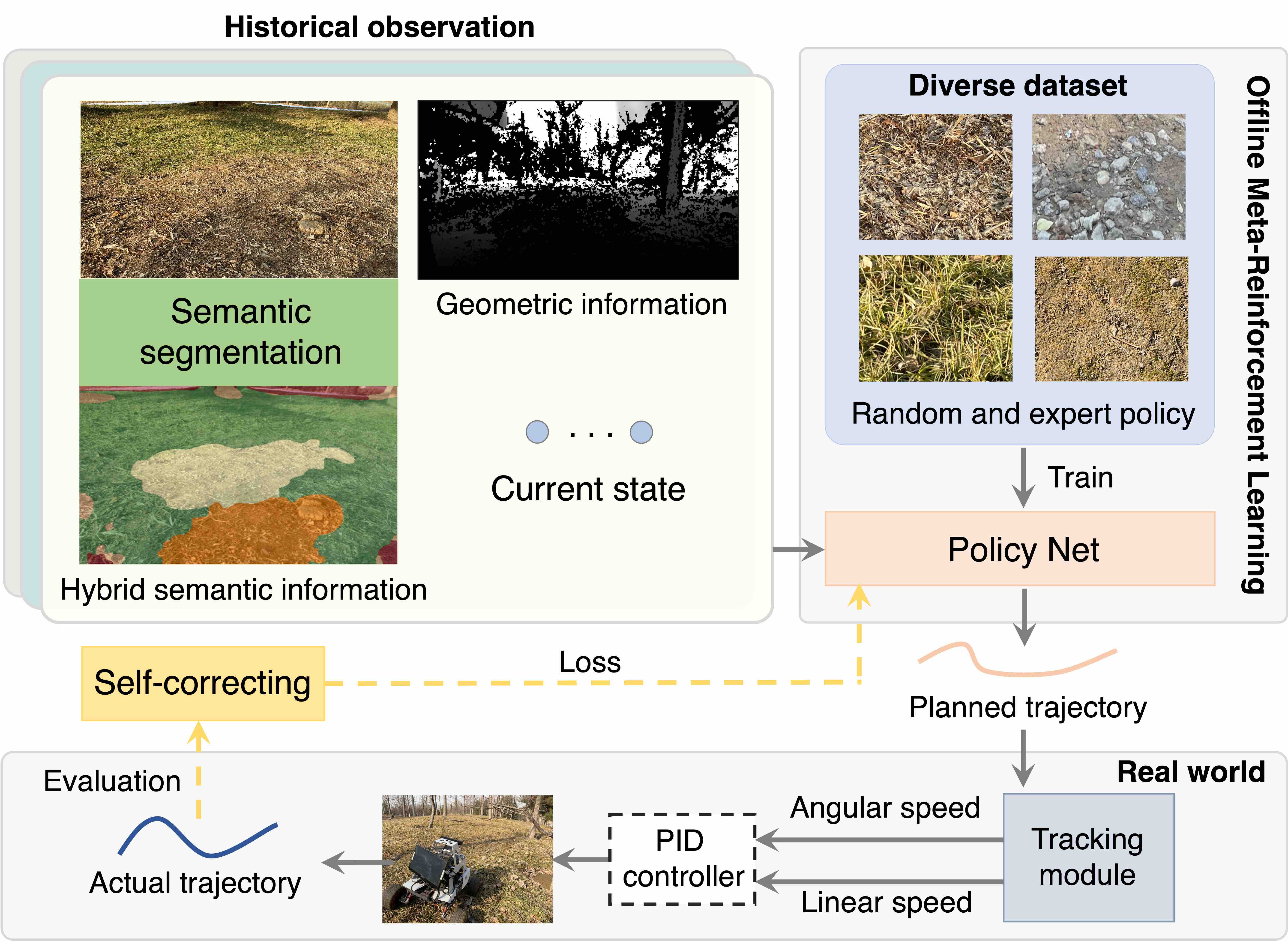 SCOML: Trajectory Planning Based on Self-Correcting Meta-Reinforcement Learning in Hybrid Terrain for Mobile Robot